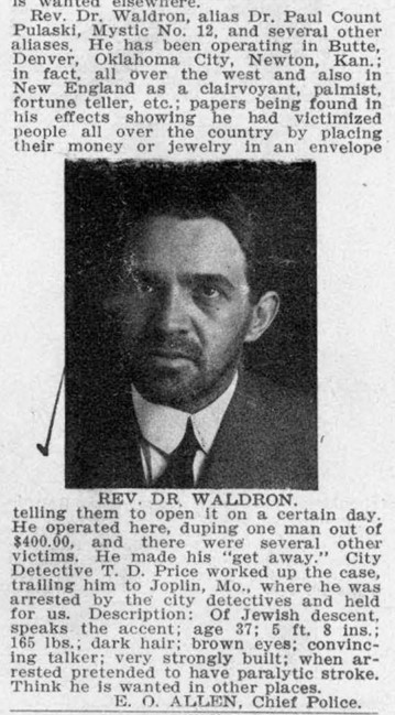 Rev. Dr. Waldron, alias Dr. Paul Count Pulaski, Mystic No. 12, etc. (pictured on the right) made a fortune convincing patrons hoping for answers from beyond to put their valuables (money, jewelry) in envelopes to be opened later (I’d have loved to hear his script/explanation – an offering/sacrifice to the spirits, maybe?). Of course when that later day came, they found their valuables replaced with junk and Waldron long gone. When periodically arrested, he pretended to have a paralytic stroke – which likely landed him in the hospital where he could escape.