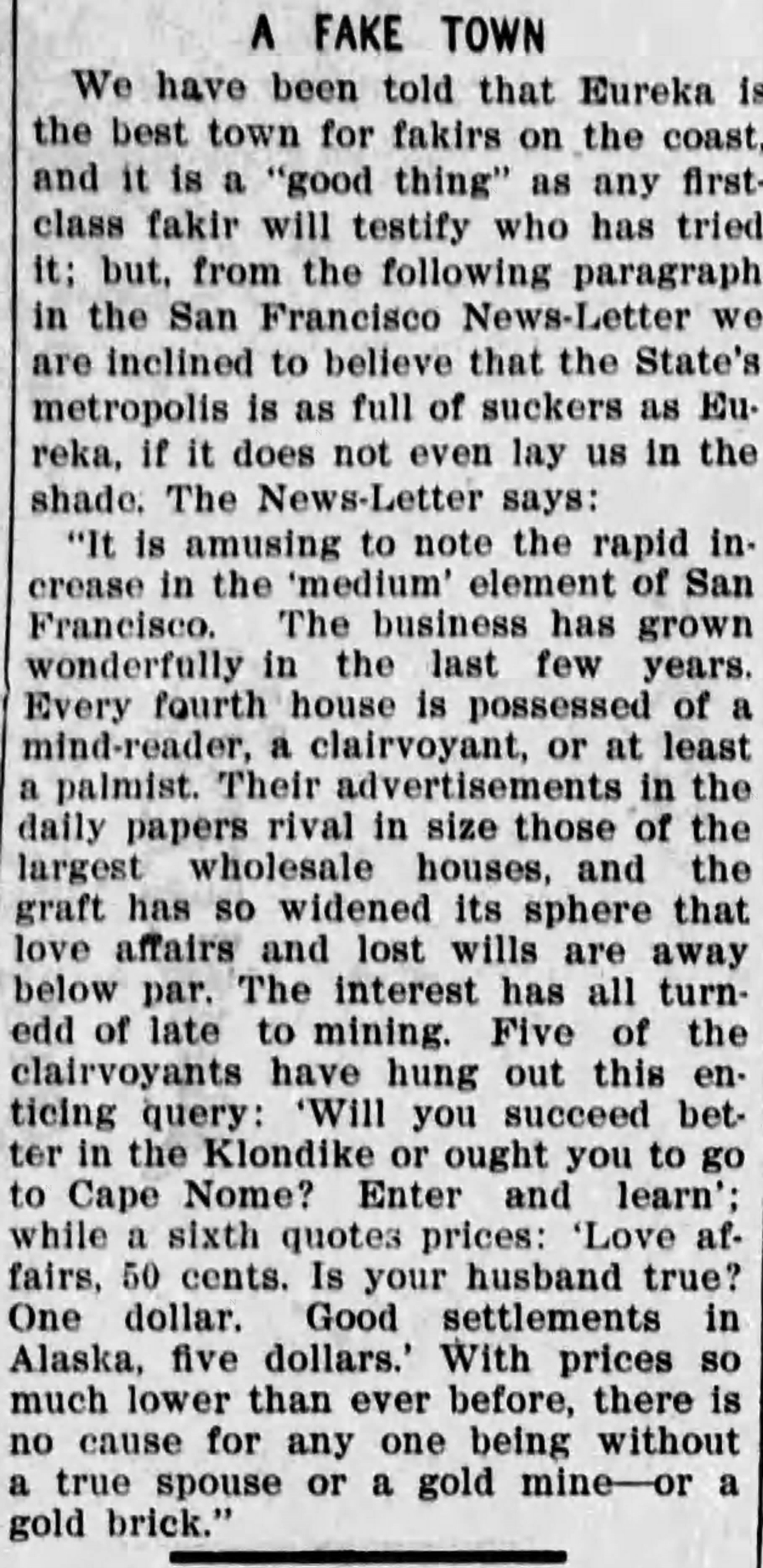 In the early 1900s, Eureka (where I live) was considered “full of suckers”, though local reporters tried to convince readers that people in San Francisco were just as gullible (see story below). Eureka’s reputation prompted many palm readers and fortune tellers to pass through here regularly despite requiring a steamer ride from San Francisco. While some may have thought themselves legit, most traveled the country, set up temporary shop and scammed the locals before moving on.